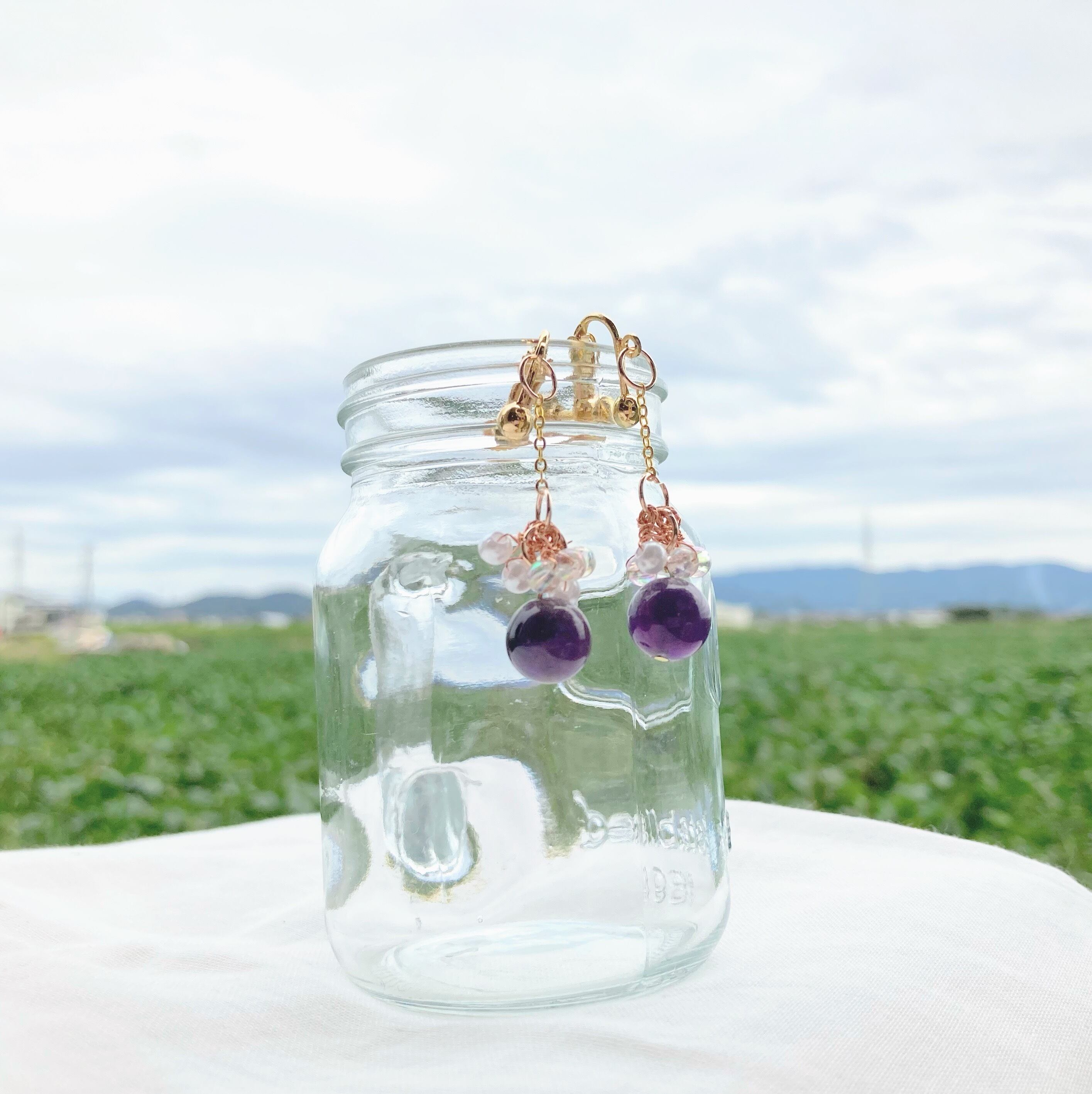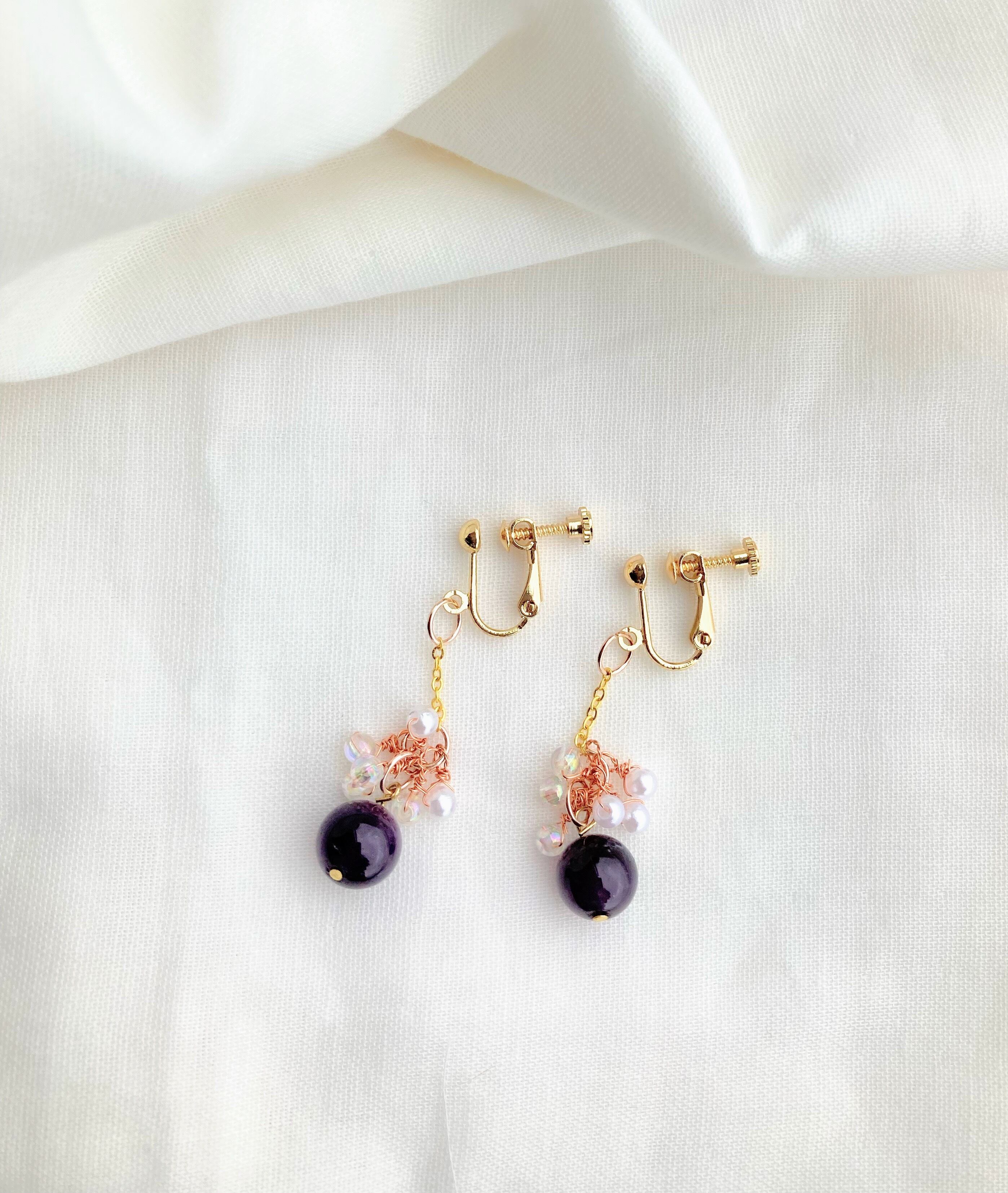 上品な深紫のアメジストと純白・クリアビーズの揺れるアクセサリー