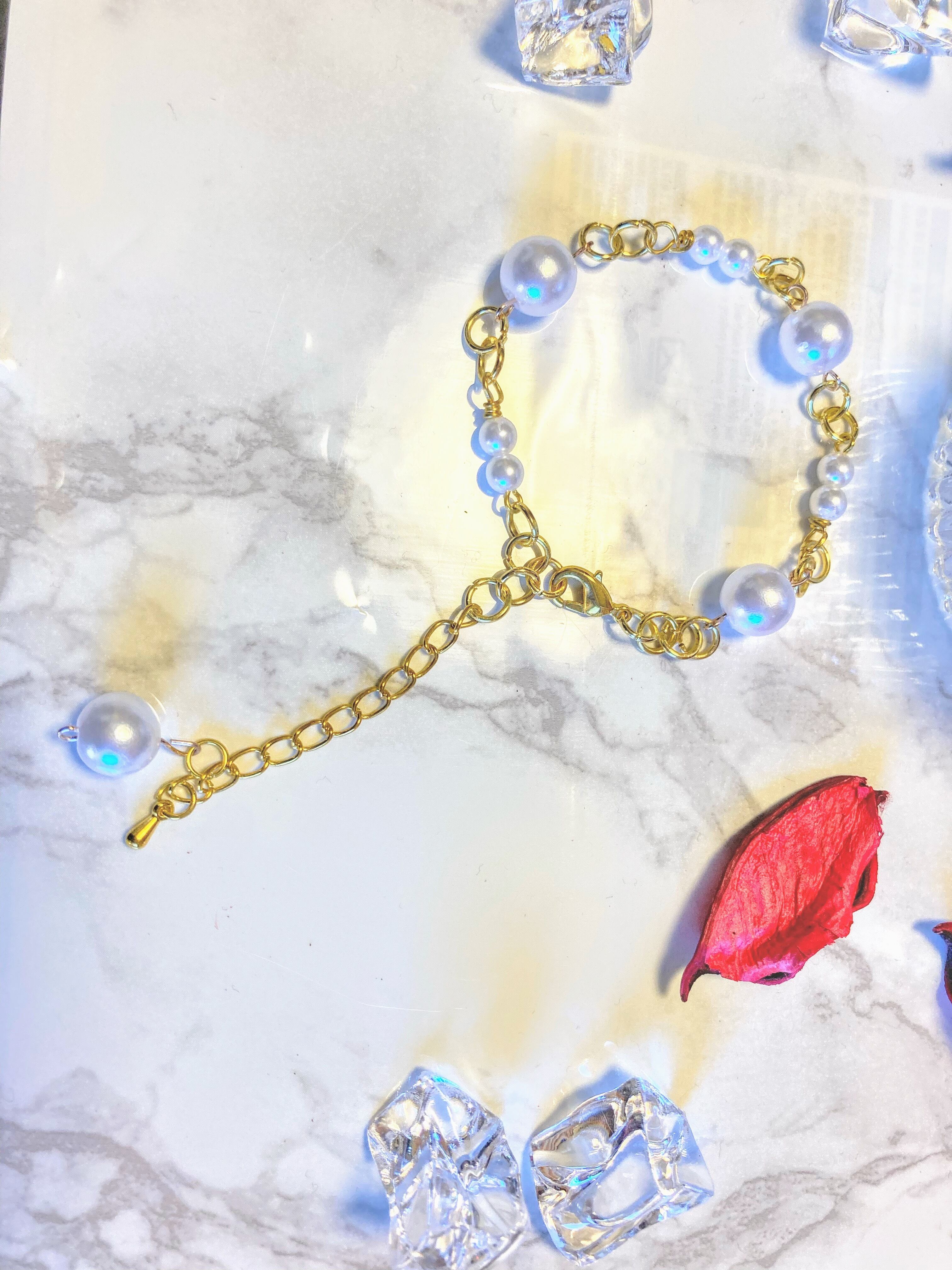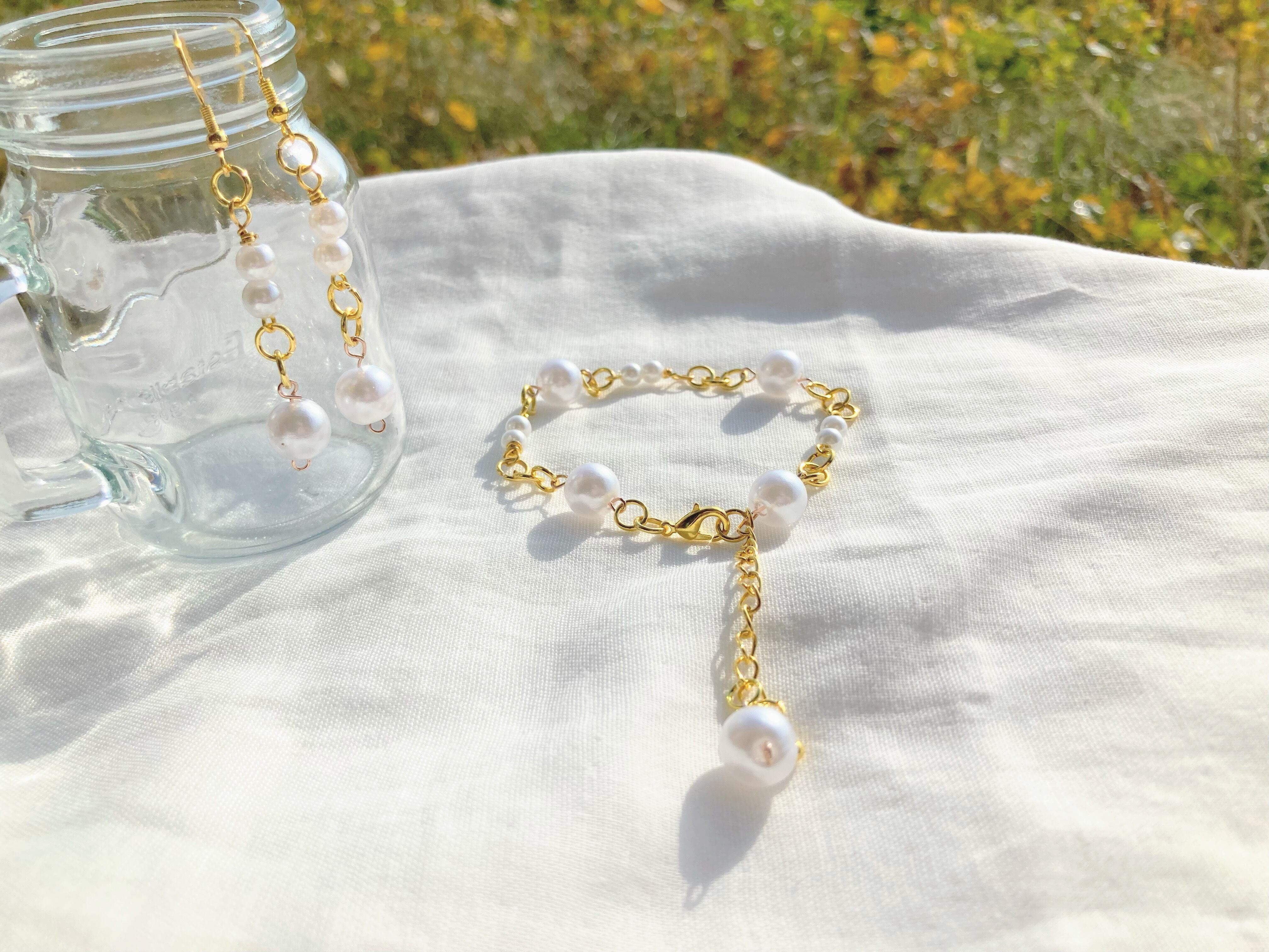 大きいホワイトパールビーズと小さいホワイトパールビーズが交互に並んだナチュラルで上品なブレスレット
