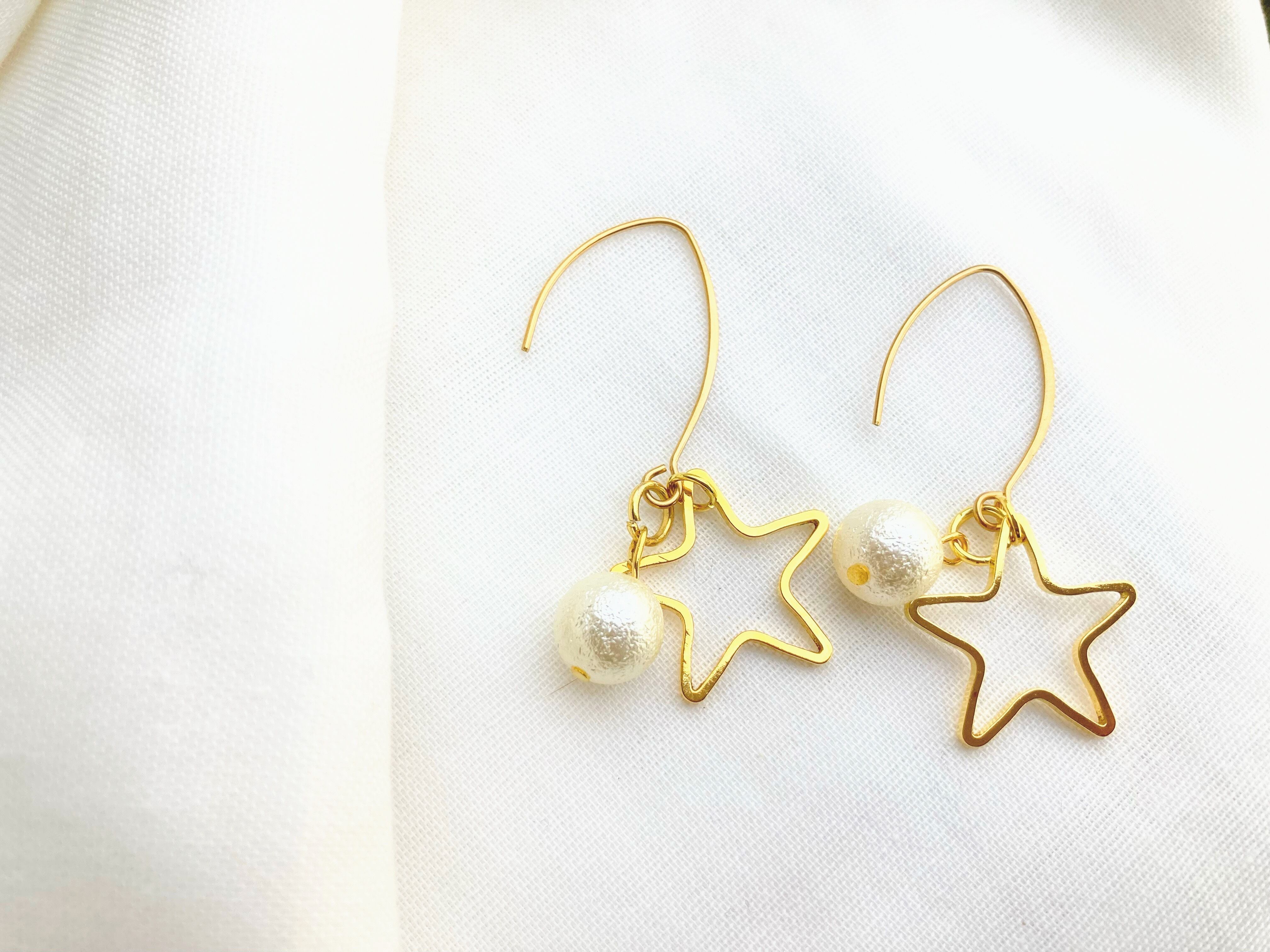 コットンパールと星のパーツを使用し、シンプルなデザインのピアスです。