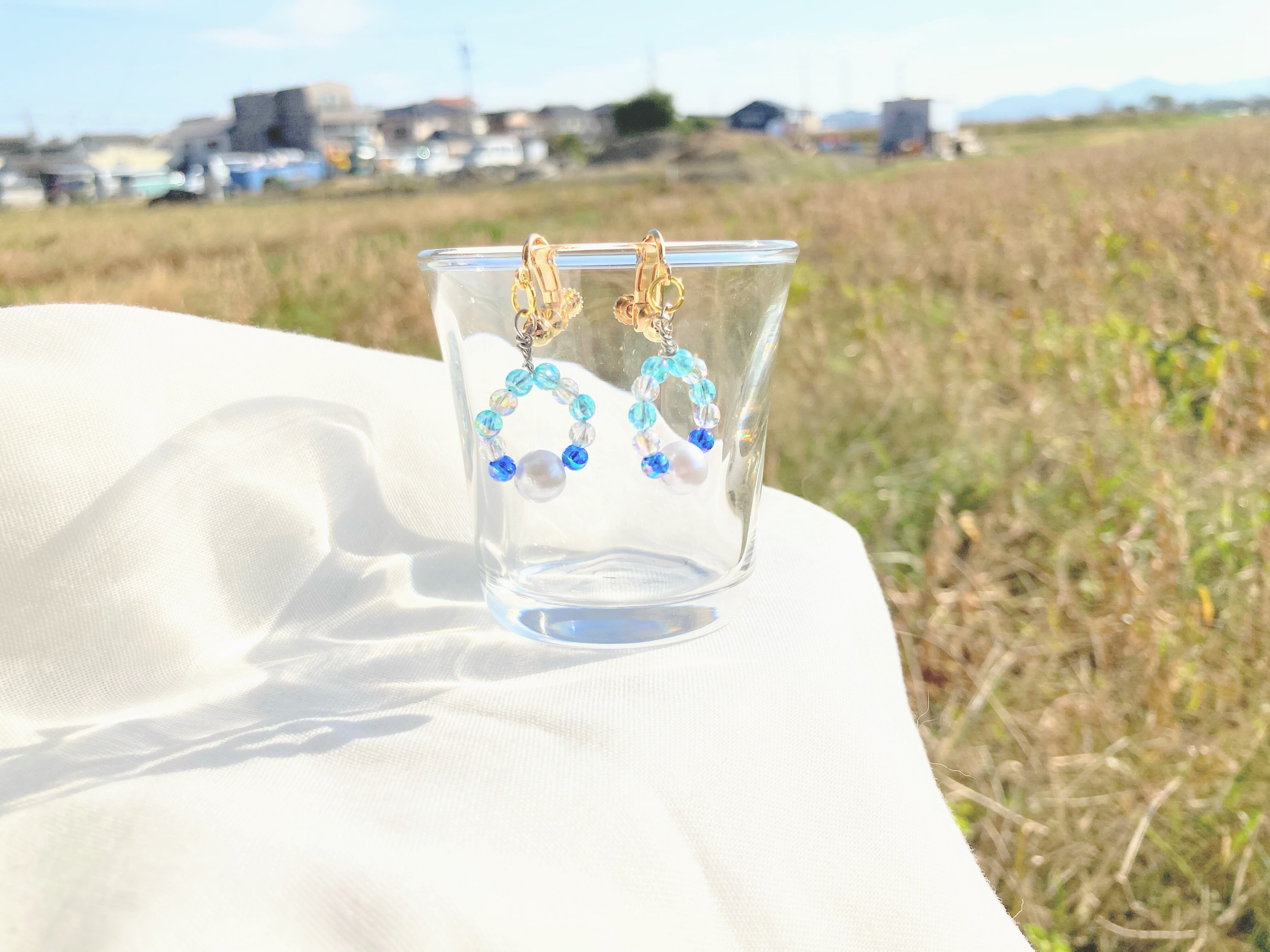 ホワイトパールビーズ・小粒なブルー・クリアなビーズをリース風に加工したイヤリングです。