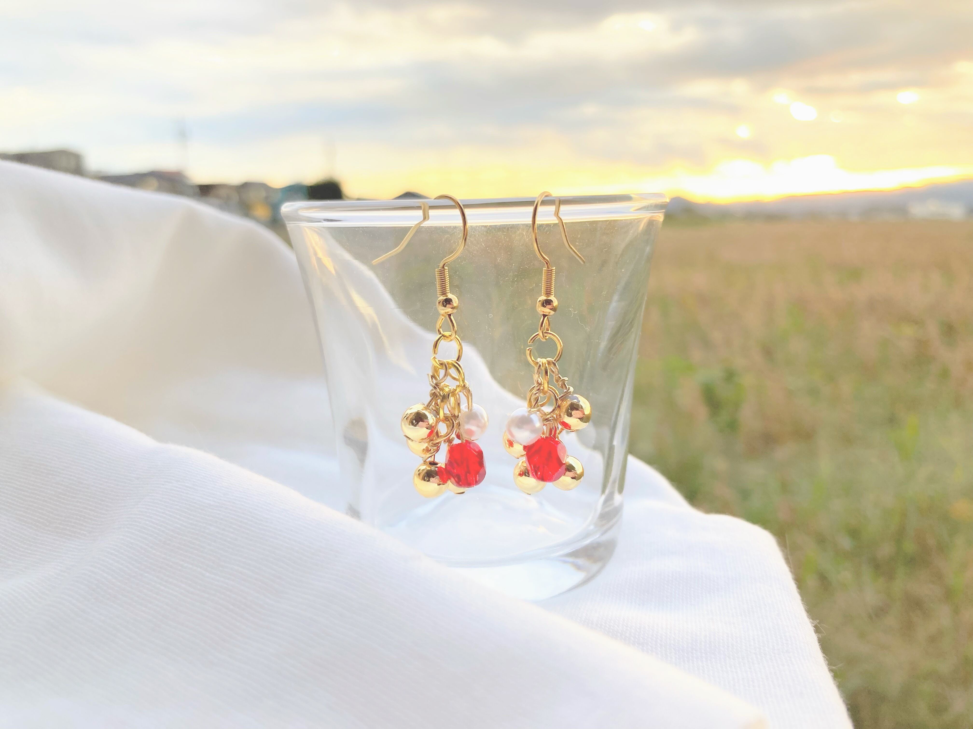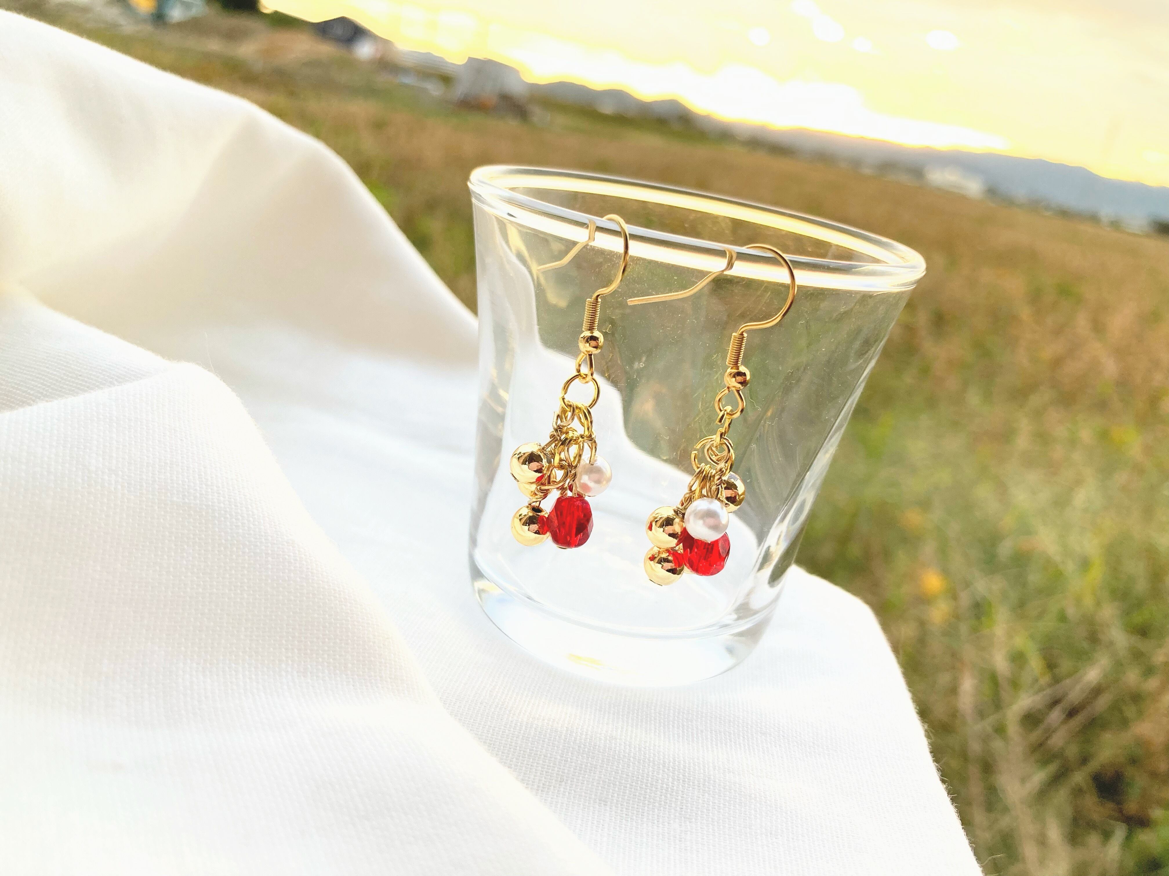 いちご色のファイアポリッシュチェコビーズと4mmのパール・ゴールドビーズがユラユラ揺れるかわいいピアス♡