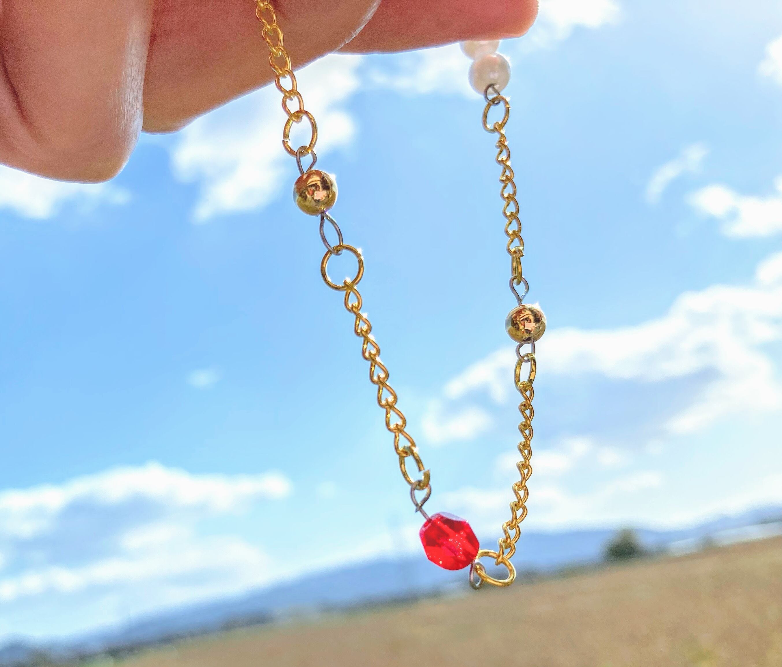 いちご色のファイアポリッシュチェコビーズと4mmのパール・ゴールドビーズのチェーンアクセサリー♡