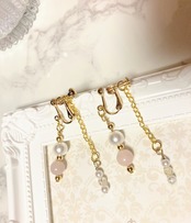 柔らかいローズクォーツと上品な淡水ホワイトパールとゴールドビーズが並んだデザインのイヤリング