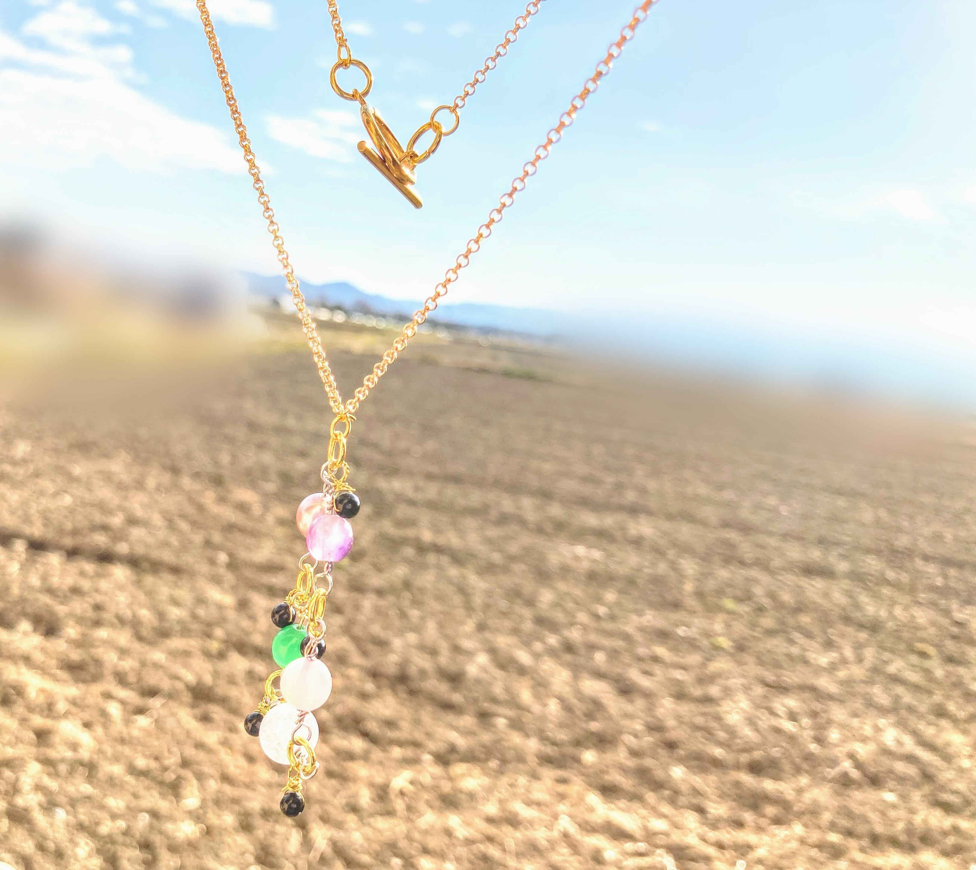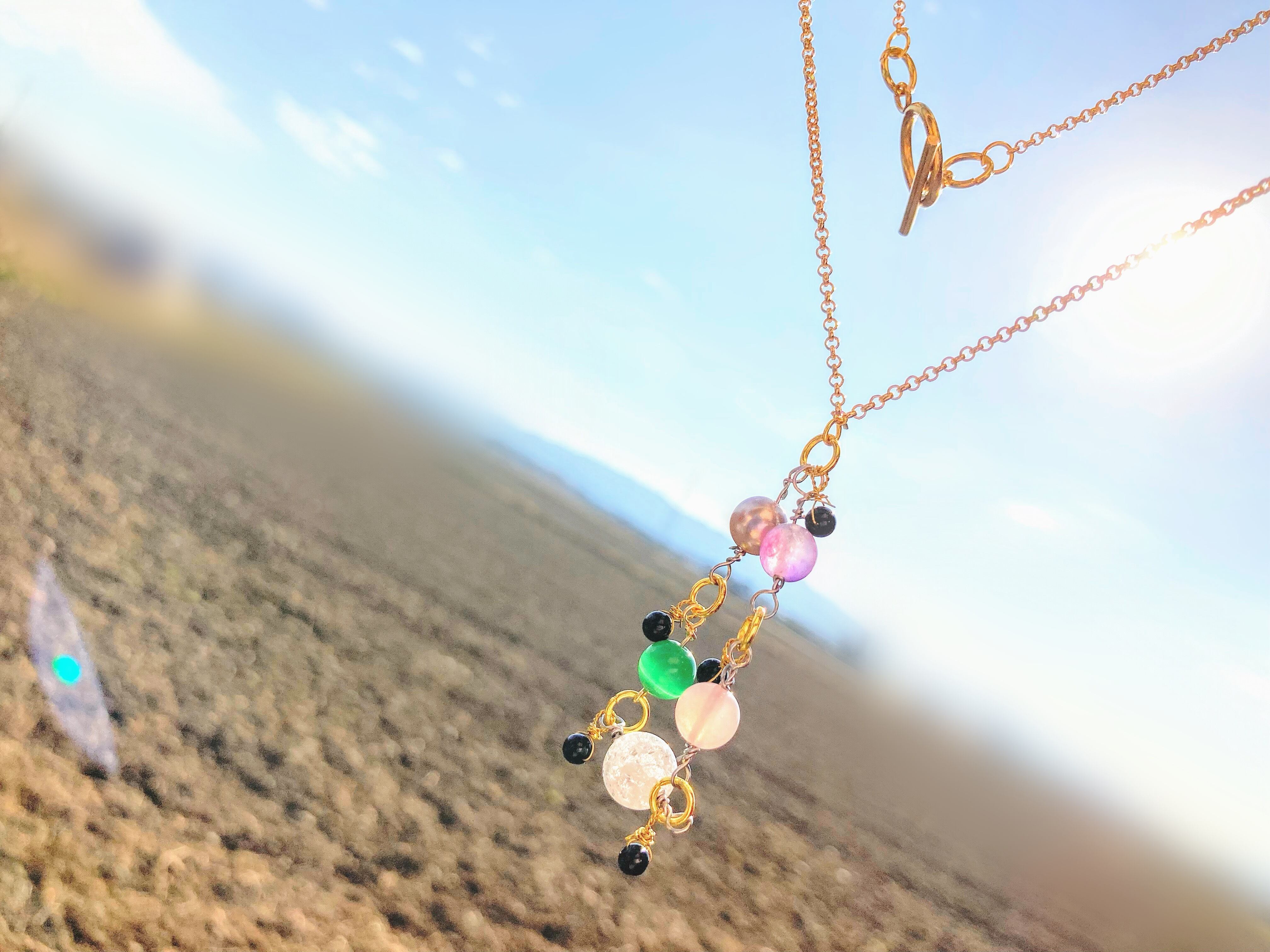 天然石をマルカンでつなぎ円にし、動きのあるネックレスにしました。