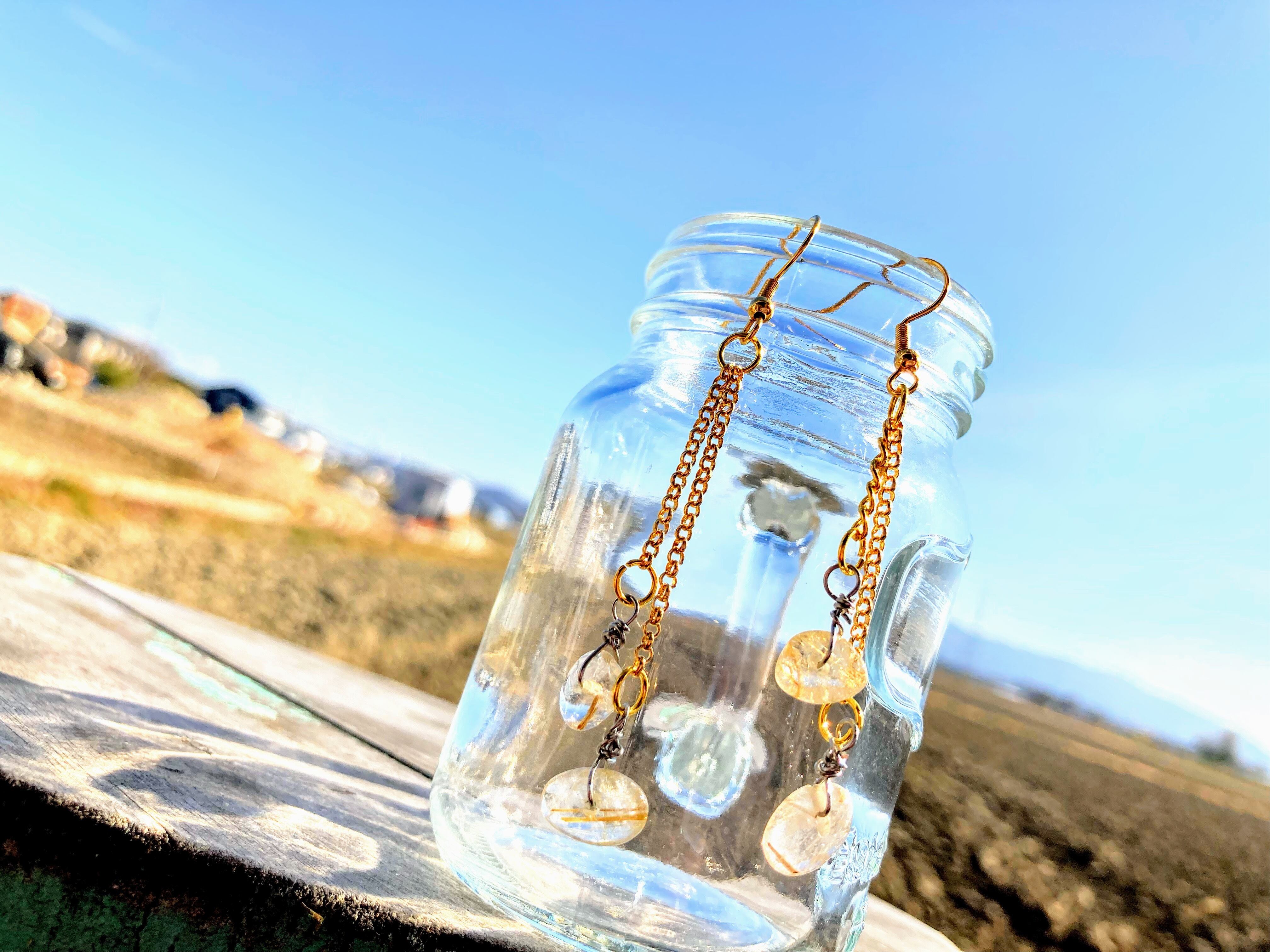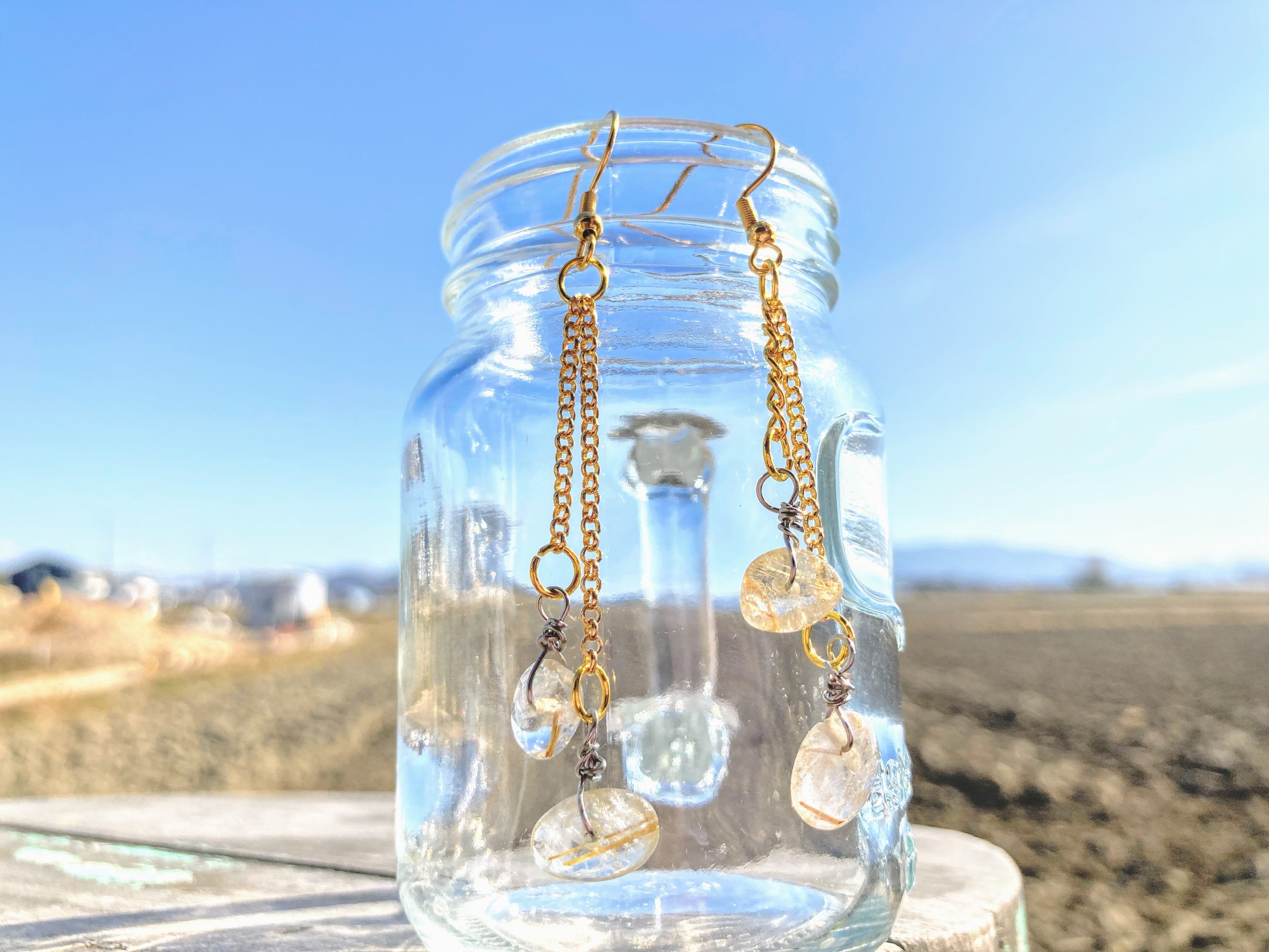 針のように細いルチルが縦横無尽に水晶の中で伸びている大きな天然石と小さな天然石がチェーンに繋がれてユラユラ揺れるピアス♡