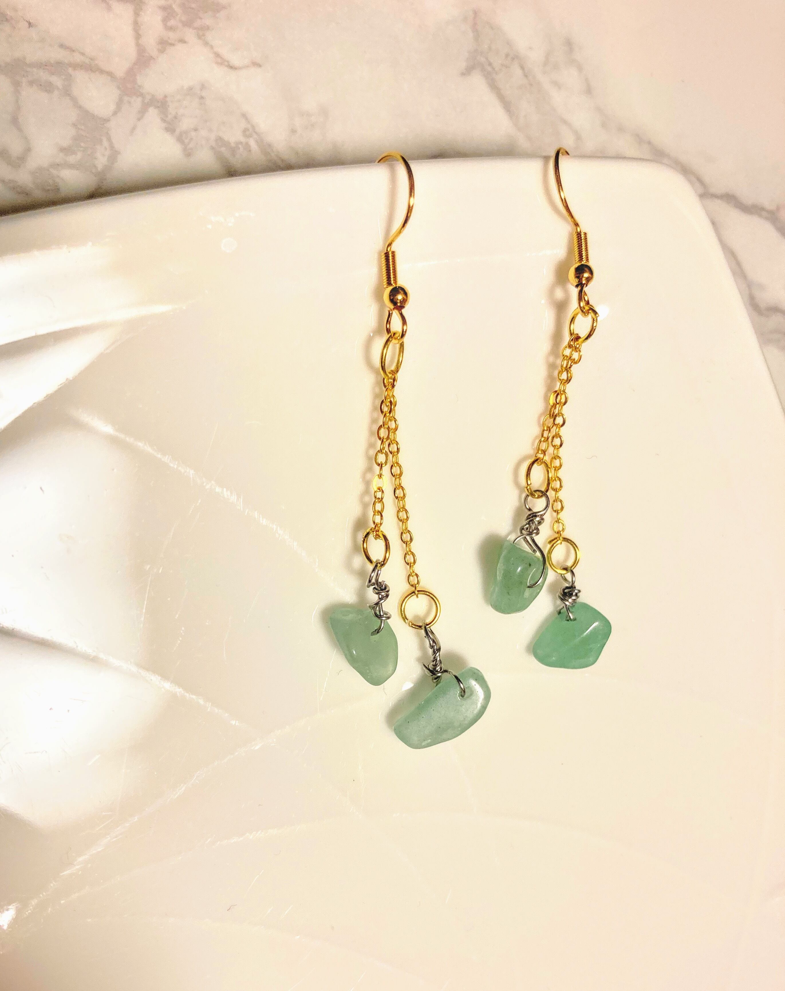 大きさと形の違うアベンチュリンがチェーンで揺られる姿は落ち着きがあって上品な印象です。