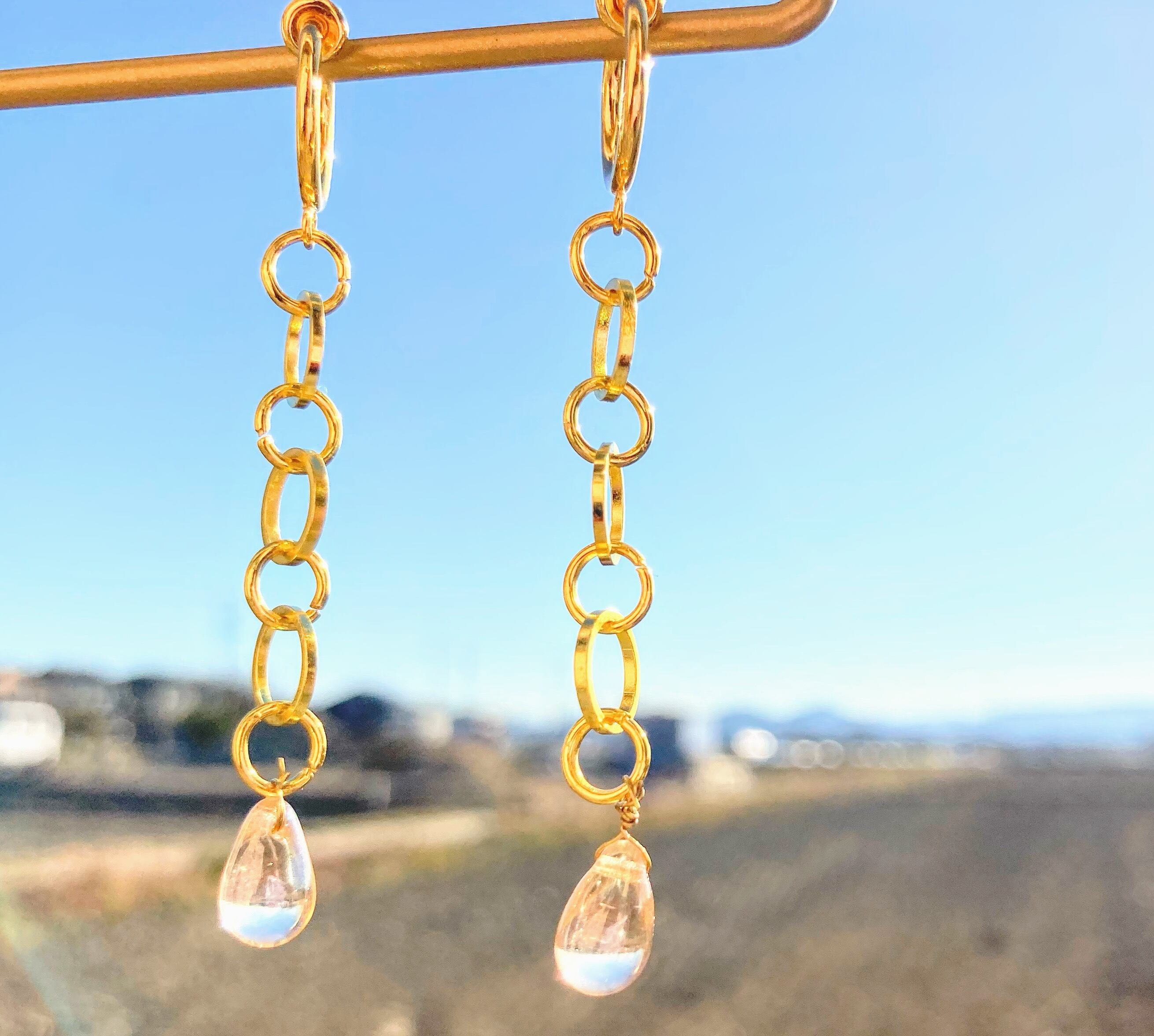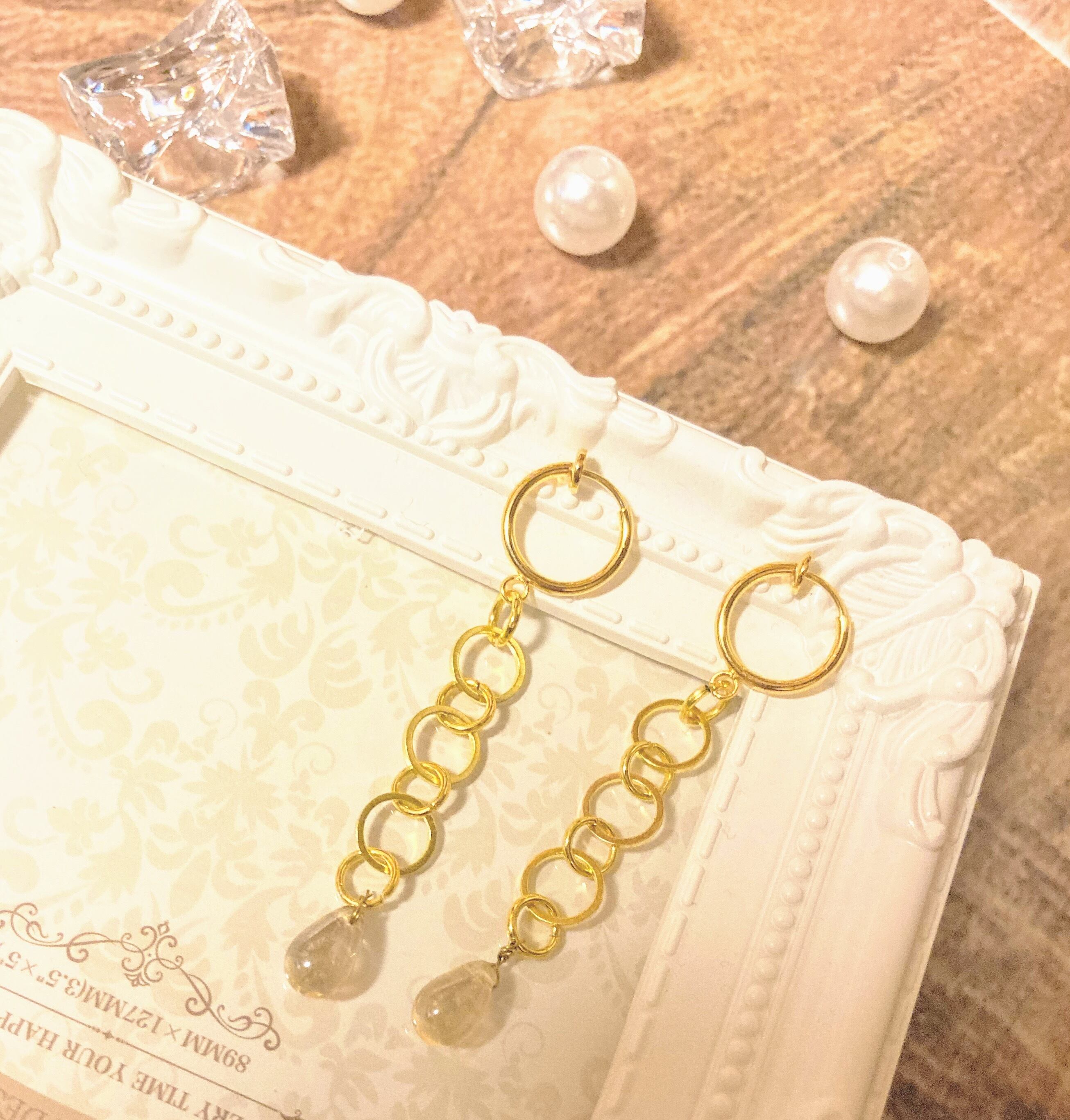 3個のラウンドリングフレームが丸カンで縦に並び、しずく型のチェコビーズがゆらゆら揺れて輝きを放ちます。