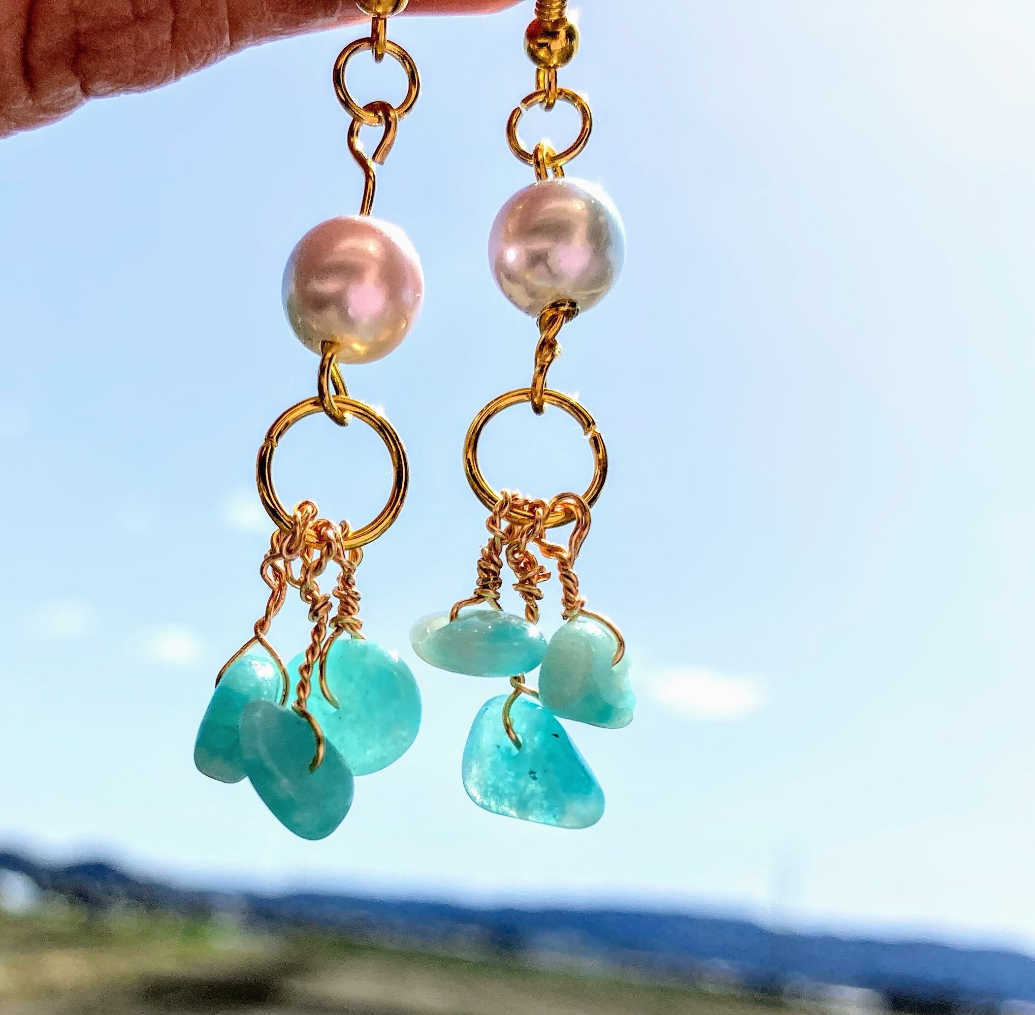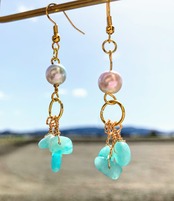 グラデーションビーズとさざれ天然石とゴールドリングの揺れるピアス