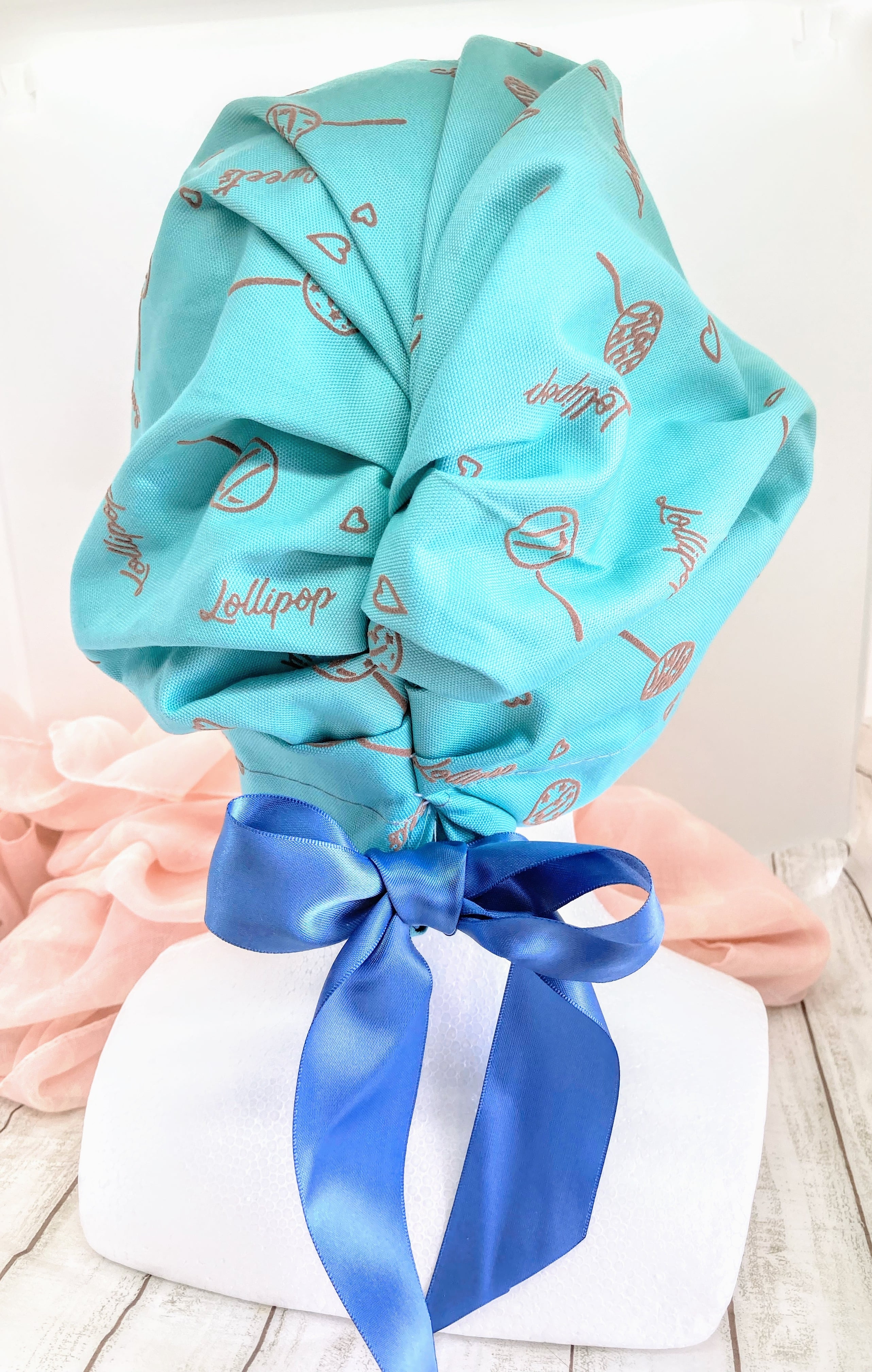 キャンディーとハート柄のターコイズブルー色の生地で作ったキュートでポップな帽子♪