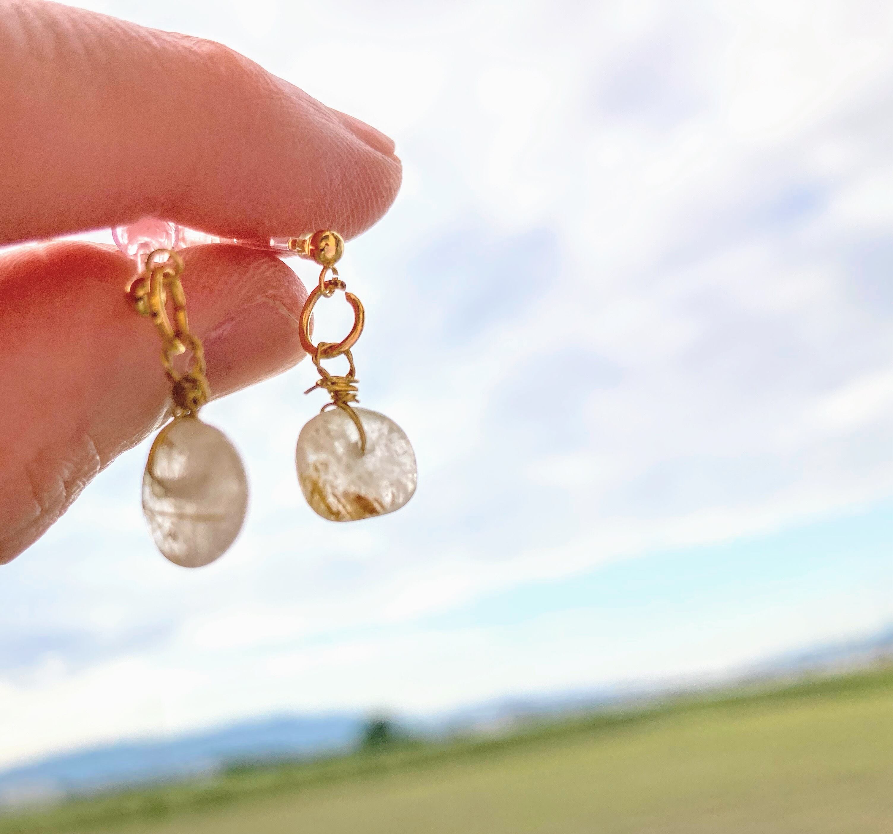 黄金色に輝く針のように細いルチル(鉱物)が縦横無尽に水晶の中で伸びている天然石のアクセサリー♡